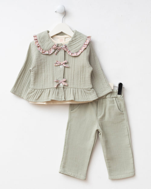 Fiyonk Detaylı Bebe Yaka Müslin 3’lü Bayramlık Kız Bebek Alt Üst Takım (9 Ay - 3 Yaş)