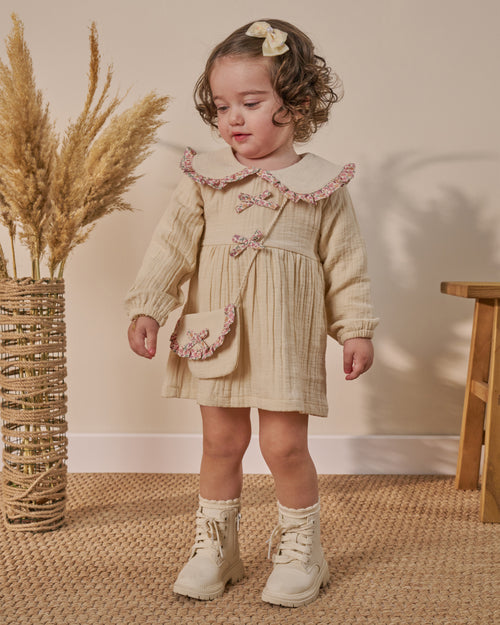 Fiyonk Detaylı Çantalı Bebe Yakalı Müslin Bayramlık Kız Bebek Elbise ( 9 Ay - 3 Yaş)