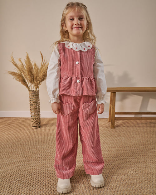 Kalp Cep Detaylı Fitilli Kadife 3’lü Bayramlık Kız Çocuk Alt Üst Takım ( 4-8 Yaş)