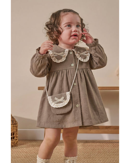 Dantel Detaylı Bebe Yaka Çantalı Bayramlık Keten Kız Bebek Elbise (9 Ay / 3 Yaş)