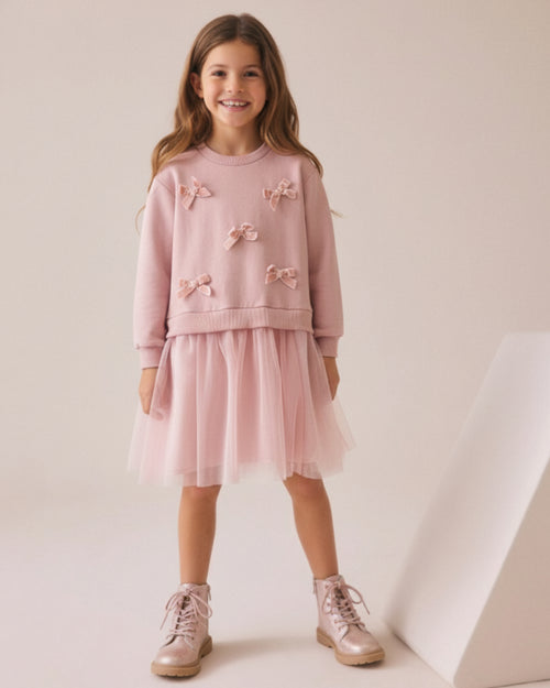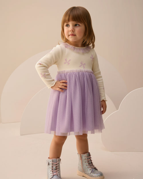 Girls Printed Tulle Dress with Bow Collar, New Year Outfit (4–7 Yrs)