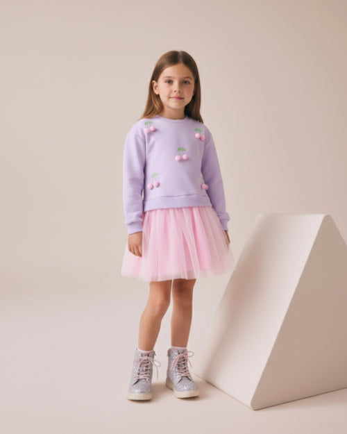 Cherry Pom-Pom Detailed Tulle Girl Dress (4-7 Years)