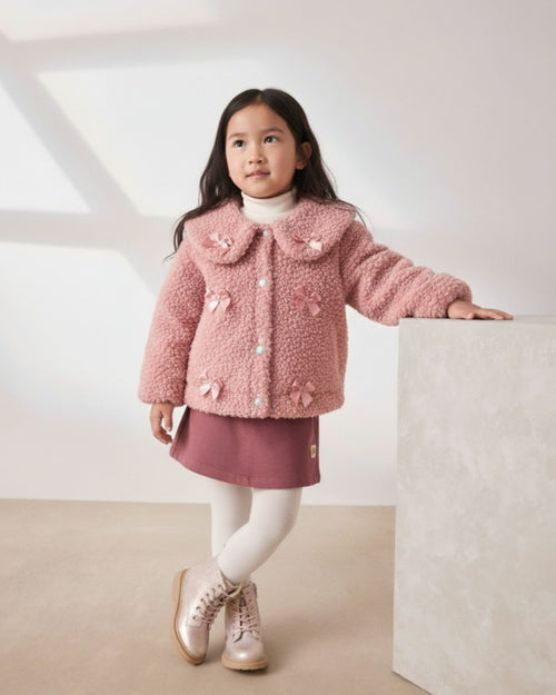 Bow Detailed and Buttons Girl's Plush Jacket (2-3 / 6-7)