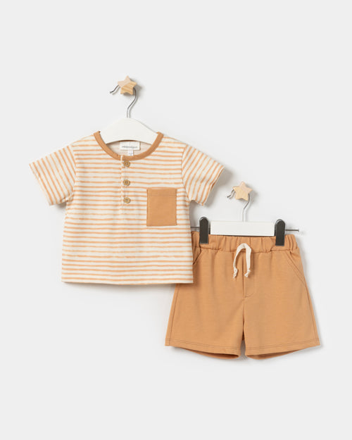 Front-Placket Striped T-Shirt and Shorts Baby Boy Two-Piece Set (6/9 Months–2/3 Years)