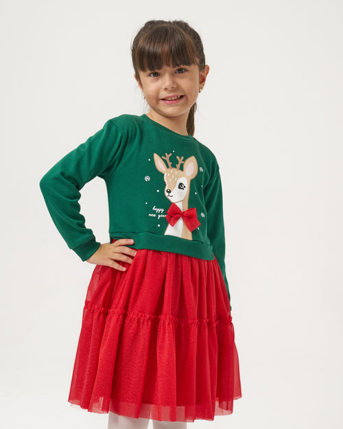 Girls Glitter Tulle Dress with Reindeer Print, New Year Outfit (4–7 Yrs)