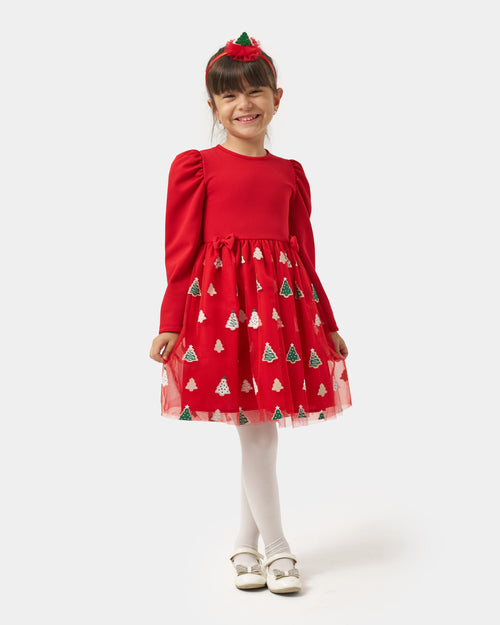 Girls Merry Christmas Printed Tulle Dress, Holiday Outfit (4–7 Yrs)